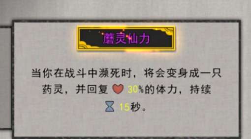 拥有蘑菇之力的前提条件下,天道筑基突破后就会出现【蘑灵仙力】,效果是:当你在战斗中濒死时,将会变身为一只药灵,并且回复30%的体力,出现15秒。(PS:后面可升级为蘑灵神力,恢复血量更高)。