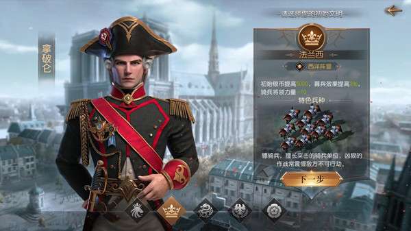 法兰西的初始设定与不列颠完全不同,法兰西更倾向部队发展,而不列颠倾向于城市建设。与文明特点相同的是法兰西的特色兵种,在解锁特色兵种“法兰西骠骑”后,统领该兵种的将领可直接获得额外的10点力量与谋略,对步兵系将领的伤害提高15%,造成的谋略伤害与物理伤害提高5%,在首回合时还会发动冲锋,有25%的几率使敌方前排陷入【震慑】(无法行动),在获得这一系列效果的同时会使自身防御降低10点,名副其实的战斗机器。