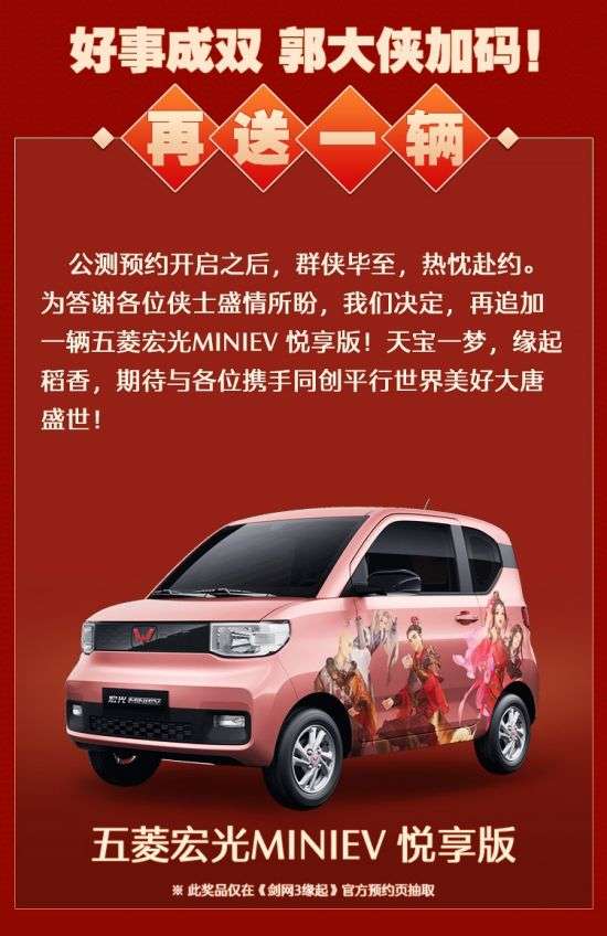 群侠毕至,热忱赴约,前来预约《剑网3缘起》的侠士已超百万,预约豪礼【五菱宏光MINIEV悦享版】也被一位“欧皇”领回了家。如此喜庆时刻怎少得了福利再度加码,《剑网3》系列制作人郭炜炜决定追加送出一辆【五菱宏光MINIEV悦享版】!