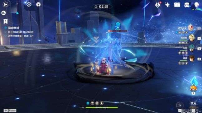 接着行秋在班尼特大招上开大、开E,然后诺艾尔开大一顿狂砍。大概打了30s,深渊使徒就开盾了。接下来破水盾就完事了。