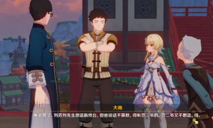 大雨修完后,开始和范二爷算工钱,范二爷狮子大开口,反手把工钱砍掉1/4的两千摩拉(爷看了会落泪)。这边云先生和范二爷正在串供,对外都说云先生找【星燕】姑娘一起绣花,实则两人是要去看摇滚演出。(看来不是一次两次了)