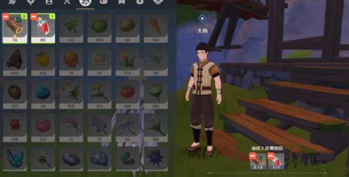 路爷和若心前辈向我们推荐大雨,大雨也答应跟我们去造新戏台,不过大雨的手头活还没做完,需要我们原地掏出三根松木和一份红染料(咱是谁啊,说掏就掏)。