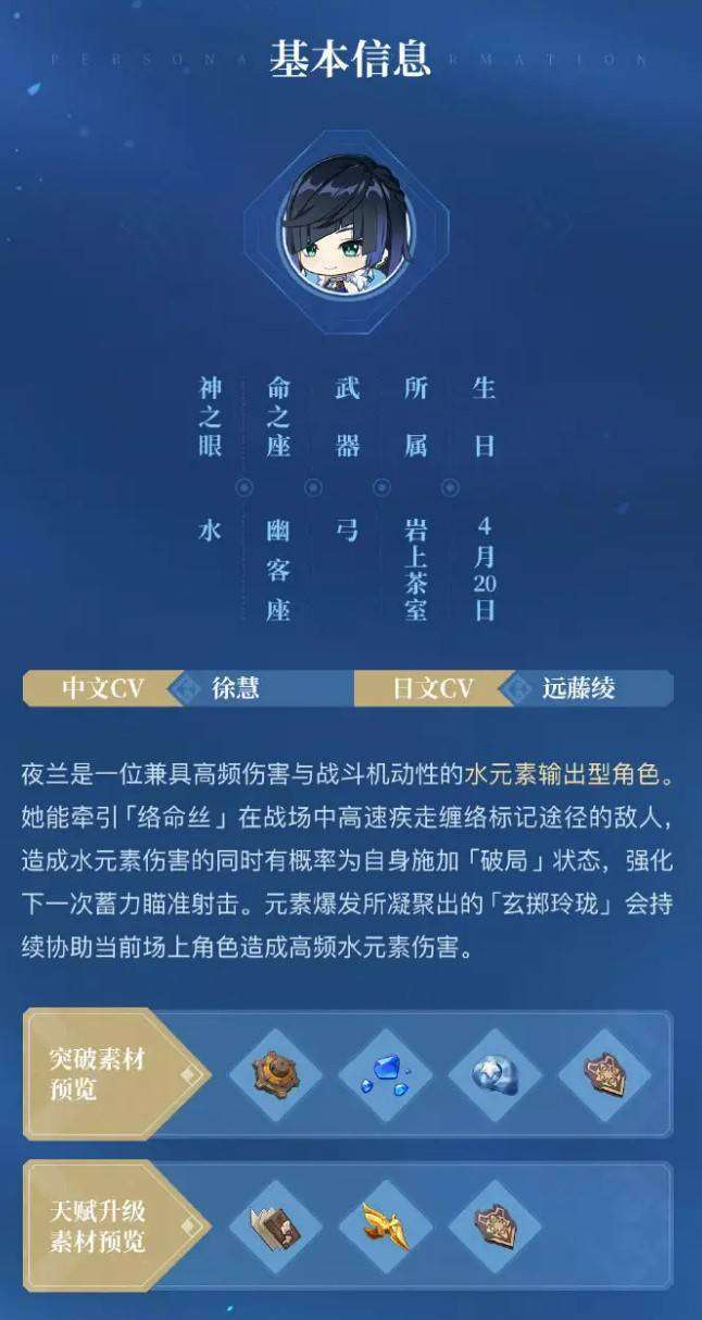 夜兰是璃月地区的5星水属性人物,天赋突破需要的材料为:繁荣,鎏金之鳞,徽记。
