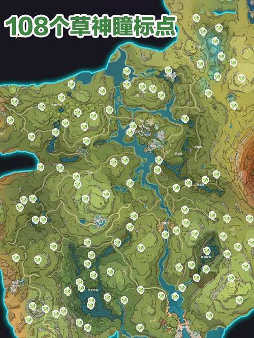 1、原神3.0版本中草神瞳在地图上 一共有108处,不知道怎么收集的玩家可以参考上图的标记。