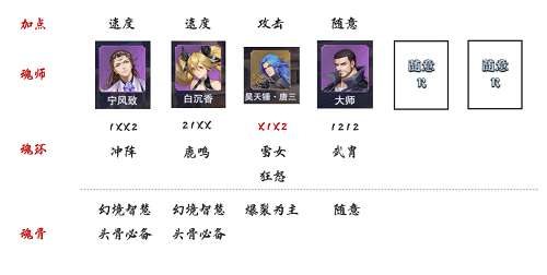 2、此阵容中的大师是用来增伤的,牛皋是用来提升我们生存能力的,剩下的两个R级别魂师大家随意选择即可。
