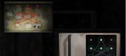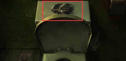 3、来到浴室点击旁边的画,记住上面的图案,然后来到马桶这里,照着顺序按冲水按钮,得到刀片,割开镜子旁边的胶带,获得电池。