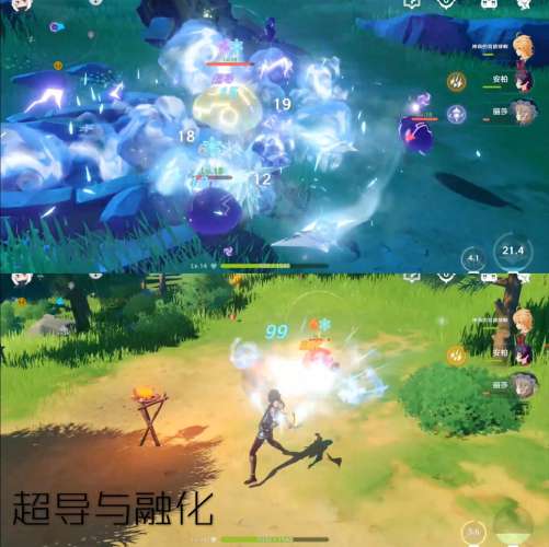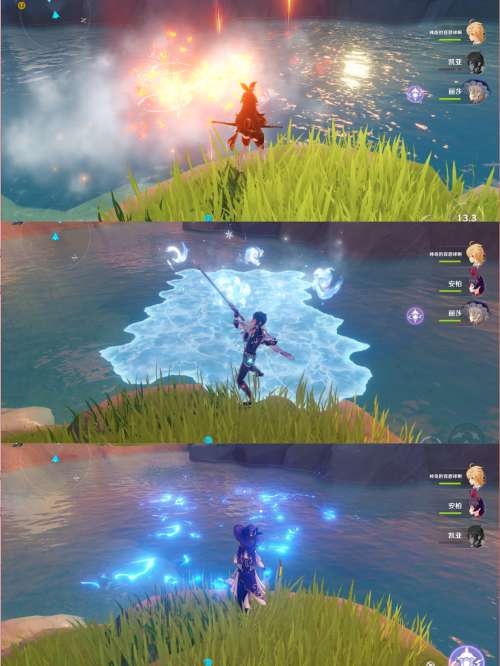 除此之外,对着水面释放火属性的技能可以产生蒸发效果,释放冰属性技能可以让水面暂时结冰,释放雷属性技能则是让附近区域变成感电状态,这些效果同样可以作用于水元素的怪物身上。