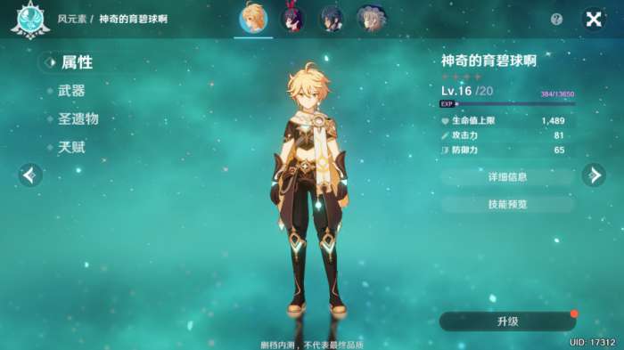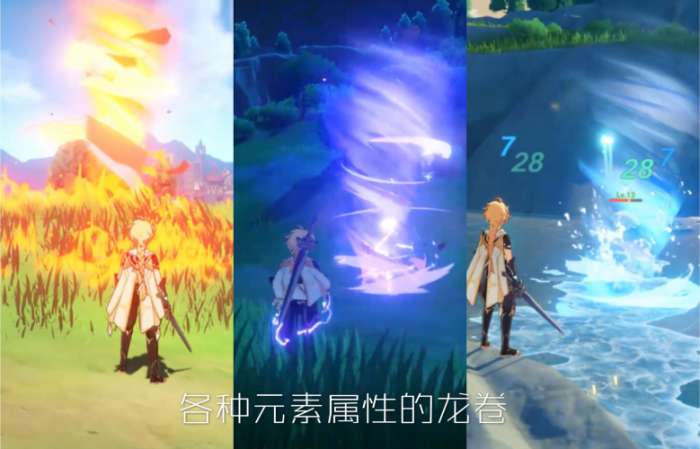 在原神这款游戏中,一共有七种元素属性,不同元素间的碰撞都会产生不同的效果,就以我们现在的四位初始角色来说——主角的技能是风属性,另外三位则依次是火 冰 雷。