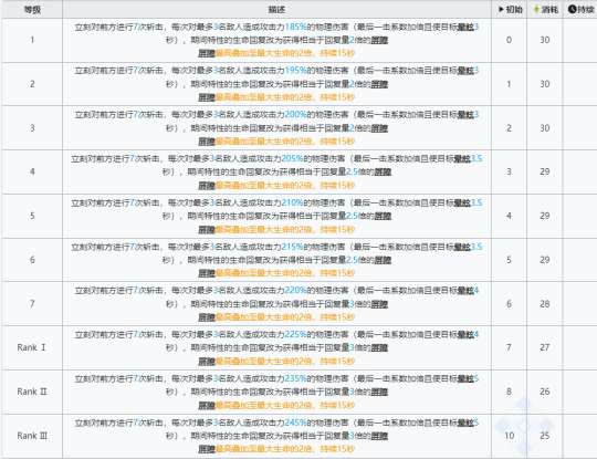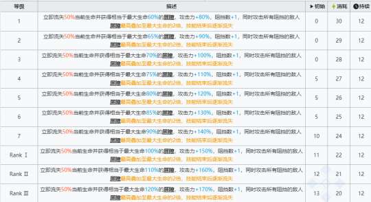 该技能会立即损失一定比例的当前生命值,但会获得相当于最大生命值一定比例的屏障,并增强攻击能力、增加阻挡次数。该技能可同时攻击所有挡路的敌人。