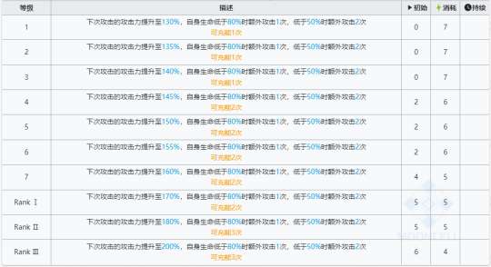 这个角色具有“攻击连击”特性,意味着下次攻击力会提升。同时,当该角色的生命值低于一定比例时,会额外攻击1次。当该角色的生命值低于更低的比例时,会额外攻击2次。