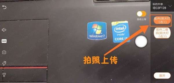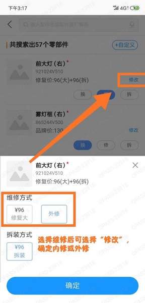 2、点选外修的配件,需要在定损页面发送外修,并在对应的配件外修照片栏目上传配件所示照片。