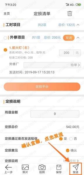 3、录入定损项目完成,检查有无遗漏,如无遗漏,可发送任务流,完成定损。如有问题说明,也可在定损说明中录入,方便后台人员审核。