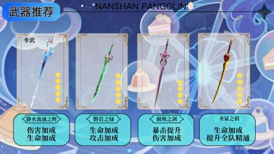 武器推荐:静水流涌之辉,磐岩结绿,圣显之钥和四星的腐殖之剑
