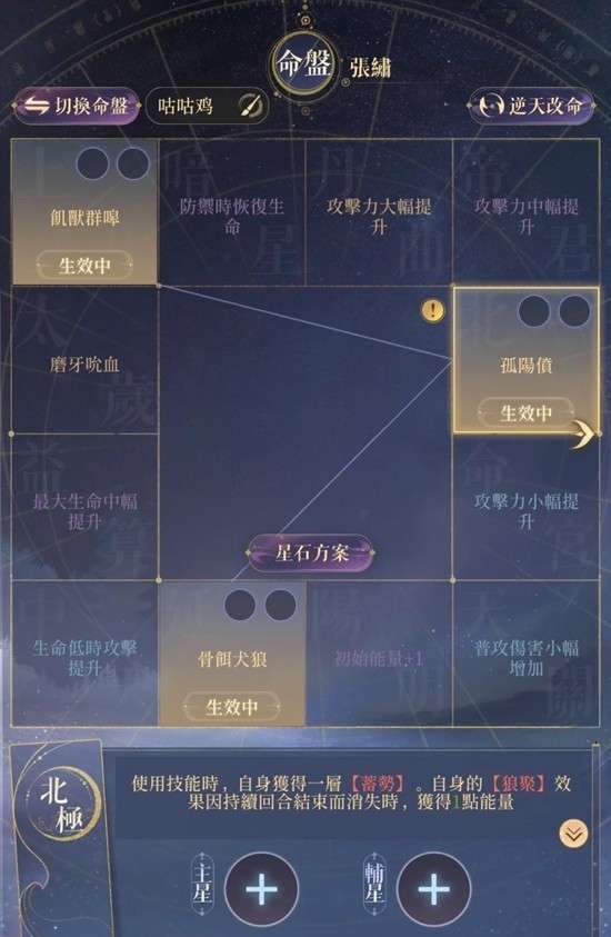 诸葛亮当队长时不需要饥兽,否则命盘几乎是强求完美“咕咕鸡”:骨饵+孤阳+饥兽(孤阳能让张绣提前一回合变成狼人)。二盘蘑菇鸡是群盘,但是几乎没用过,不用硬洗