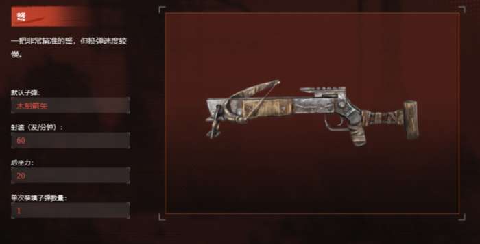 要说最基础的远程武器,那必然就是弩箭了,弩箭本身的获取方式足够简单,并且他的射击精准度极其的高,在夜间希望对敌方进行偷袭的时候,弩箭可以完美做到一击必杀,毫无声息地将敌方的哨兵解决掉,还不会对周围的其他敌人造成惊扰,特别适合在暗中行动做暗杀这一类的活动,在对局中,弩箭也是大多数玩家们所选择使用的刺杀武器,不过这个武器的缺点很明显,换弹速度很慢。