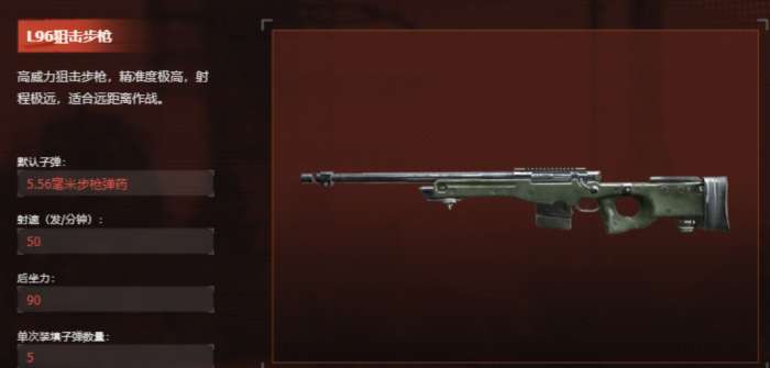 而所有武器中步枪自然也拥有着远距离的步枪这一类型,L96狙击步枪就属于可以远程输出的步枪,之所以能够远距离输出是因为它本身的规格达到了军用级别,整个武器精准度也是相当之高,但是他单次中能够装的子弹非常少,只有5颗,它的作用主要就是靠伏击敌人,在敌人还在远距离进行靠近的时候,玩家们就可以使用这个武器进行拦截。