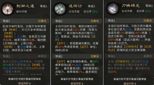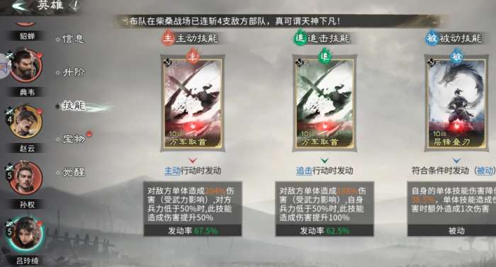 技能搭配也可以参考以下的介绍,吕玲奇追击技能和主动技能都应该带万军取首。单击倍率较高,残血时还能提升伤害,收割能力比较出色。被动应该选择层锋叠刃,虽然会降低少量的单体伤害,但额外触发一段伤害,整体的收益是比较高的。孙权主动技能应该选择力战之躯,可以回复自身的兵力,还能挑衅敌方的三个单位。被动可以挑选缮甲厉兵,前面三个回合能够给全队增加80%的格挡坦度会直接的翻倍。庞统的主动技能可以选择兵无常势,专注打敌方血量最低的单位,补刀还是很出色的。