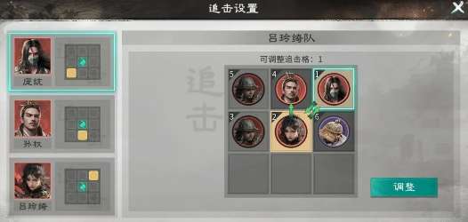 站位和兵种的搭配不可以马虎,吕玲绮要站在庞统和孙权的双重追击格上,才能触发追击技能,拥有翻倍的输出。庞统站在吕玲绮的追击格上,可以进一步的放大联动的效果。孙权不需要踩追击格,安心当工具人即可。在兵种方面要给吕玲绮搭配双穿杨军,有效弥补伤害,前方可以放能抵抗伤害的藤甲兵。后排输出,前排抗揍。这里也提醒一下所有的玩家,三位英雄只有选择升阶之后才能修改追击格。