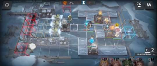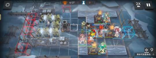 继续部署方案:先部署纯烬艾雅法拉向下移动,接着再部署艾雅法拉向右移动,最后再部署嘉维尔向左移动。在棘刺开启第二次技能后即可进行挂机。