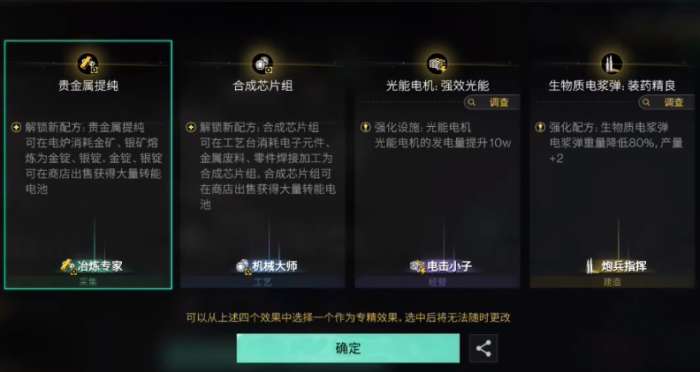 除了石油工艺专精之外,在游戏里玩家还可以借助其他的工艺,快速提升自己的生产速度,尤其是非常适合喜欢在游戏里单打独斗,自给自足的玩家,可以借助这种设定让资源得到转换,把后期不需要的常规资源,合成成稀有资源,玩家可以在此后对战的过程中获得更大的优势。