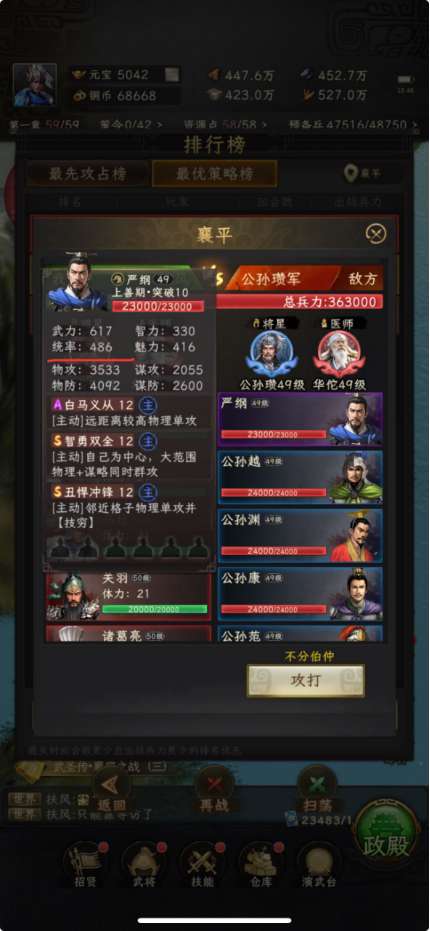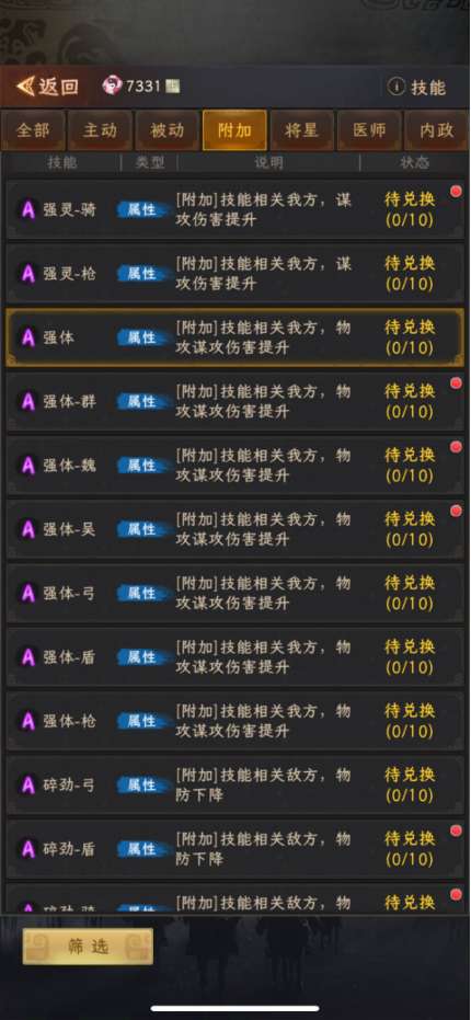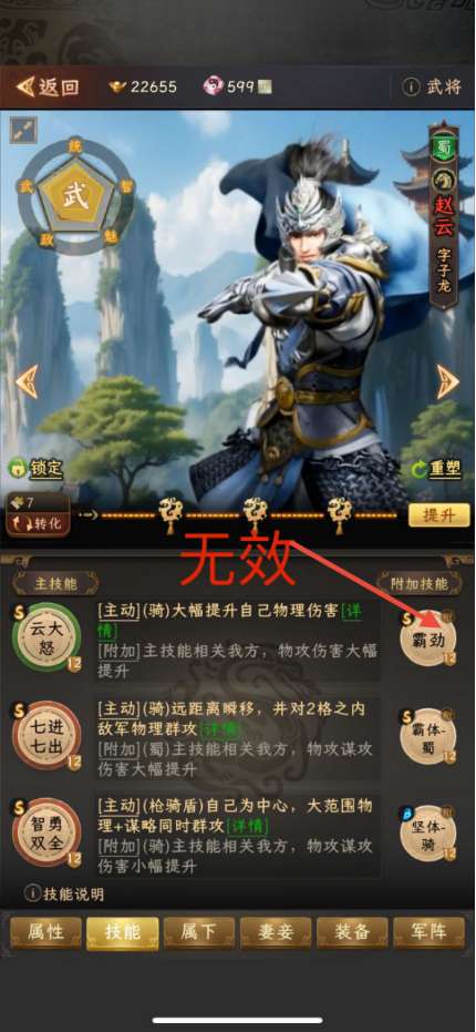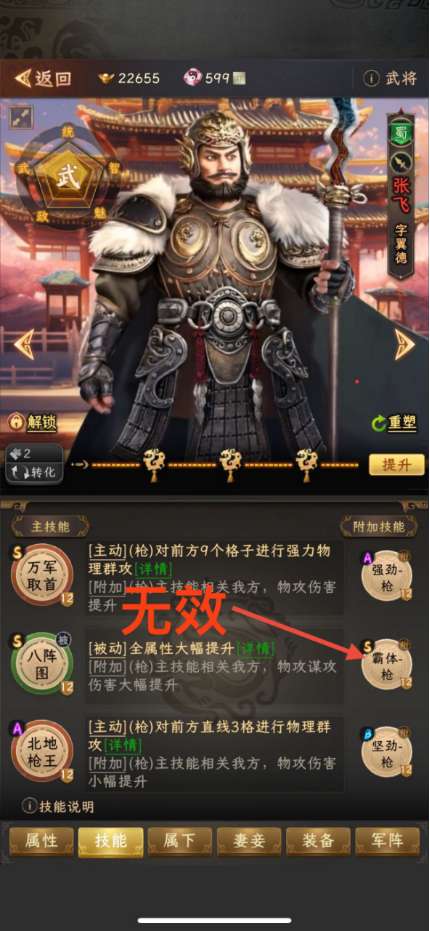 基本机制就介绍完毕了,还有一个比较重要是有些组合是无效的,如图所示,武将所带的被动技能,如果带上霸体这类附加技能,是无法触发出“霸体”等主技能增伤的效果哟。