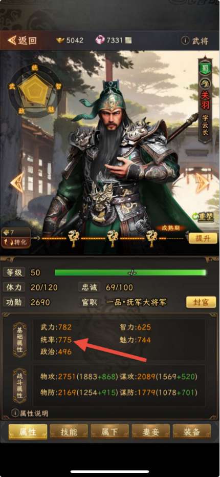 2、看清楚括号里面的触发解释,统帅高于对方生效,那么在哪里看统率是多少呢?如图所示