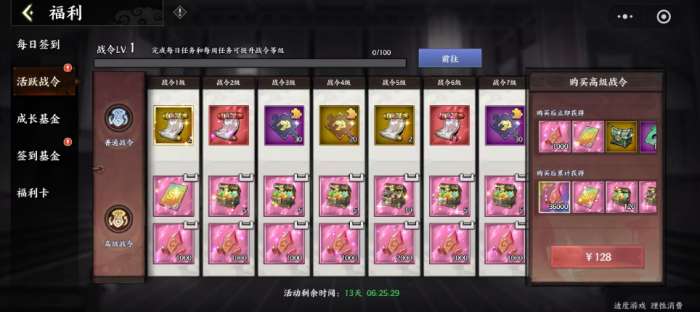 当然了,如果不氪金的玩家在这里是可以直接拿普通战令的各种奖励,愿意氪金的话,就是去购买高级战令就可以了,但是这个价格也是比较贵的,而且当前的战令点可以从每一天的任务以及每周任务宝箱当中直接领取战令活动,如果是有重置的话,在这里没有领取到奖励的玩家可以直接通过邮件来获取到自己的奖励,而在暂停活动重置的前面四天里面,大家也可以花费自己积攒的古玉,来购买这里的等级,每1级是需要消耗50古玉来进行购买的。