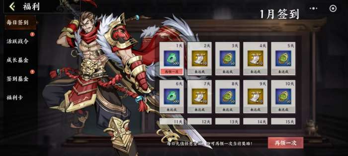 比如前期的限时特惠,还有限定天命等等奖励当中大家都无法获取,因为这都是当前进行充值才能拿到的奖励,而如果大家想要在这里直接体验一些平民玩法的话,那么一定要领的就是在线奖励,还有福利系统当中的每月签到,这里每日签到的话,通过当天的领取是可以拿到各种不同道具的,福利页面里面,大家可以看到当前的活跃战令,里面也是有相应的活动奖励,因为在活动周期里面,大家获取的战力点越多的情况下,可以解锁的奖励就越好。