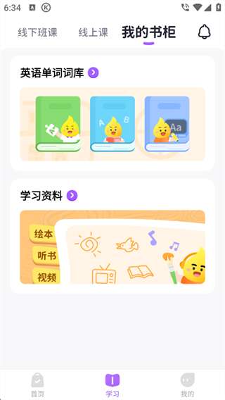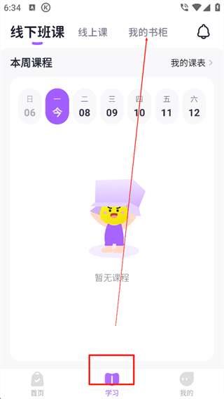 1、打开软件后,点击进入学习页面再点击上方【我的书柜】功能。
