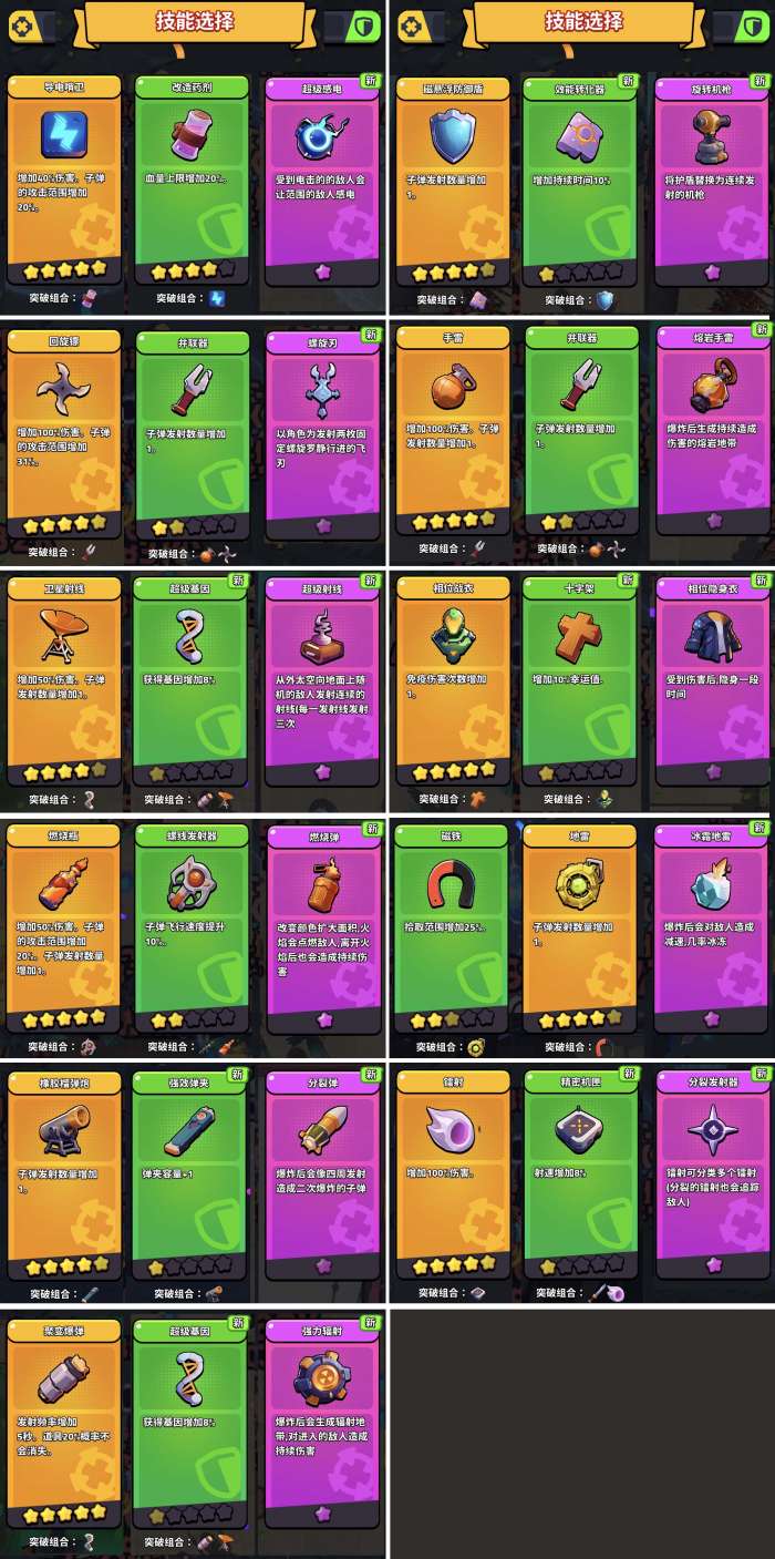 4、5星飞刀(子弹飞行速度提升20%,子弹发射数量加1,子弹持续时间加0.25秒)与1星能量饮料(每秒恢复血量增加0.2)组合可以突破进阶变为电磁飞刃。