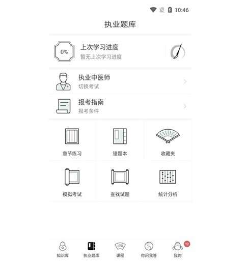 进入中医通APP,在主界面中找到并点击【执业题库】图标,进入题库功能页面。