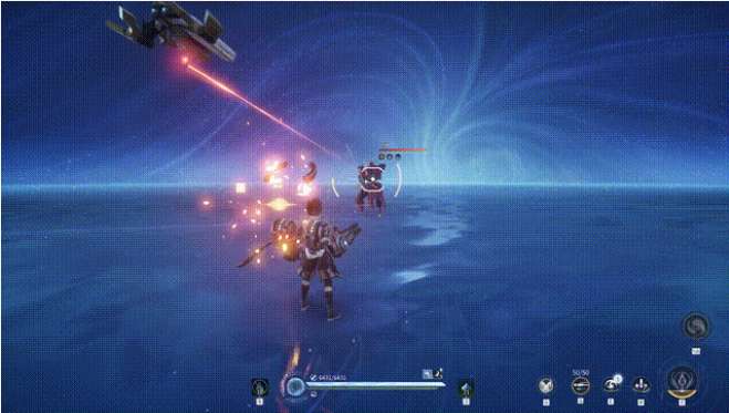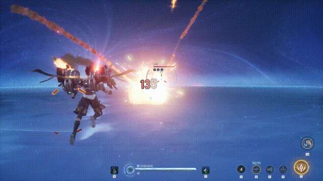 普攻发射当前装备的子弹,装配“速射弹”时,发射后累积热度值、兴奋值,对敌方单位造成伤害,装配“榴弹”时,射击需要消耗热度值,但是能积累兴奋值,对敌方造成范围伤害,榴弹发射后,选择完美时机再次发射,将额外打出1枚飞弹;