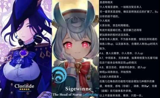 至于4.7-4.8三位新角色的定位,目前来看,希格雯主打感电(存疑)、调香师(燃烧)、克洛琳德(超载),苹果姐可能是体系外多用,按照这几位角色的功能性,后续可能会增加几种额外的赛道玩法,而4.8UP的调香师目前已知的是草系五星角色,圣遗物据说用的是4.6副本的那个套装,当然啦,版本跨度大,以上部分内容为预测,保不保真就不知道了,各位小伙伴们还需理性观看哈!