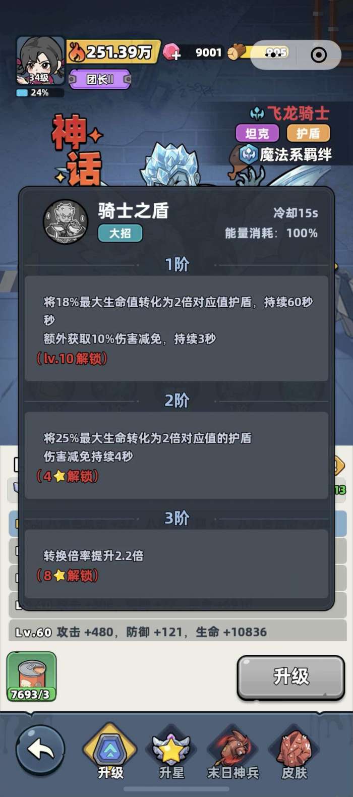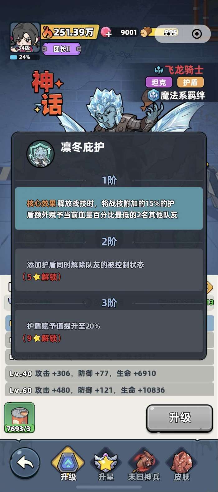他的战斗技能一共有4个,分别是两个主动技能和2两个被动技能,主动技能分别是极夜侵蚀、骑士之盾,被动技能分别是凛冬庇护和护盾强化,其中极夜侵蚀和凛冬庇护以及护盾强化是在玩家获得该英雄时就会自动解锁的节能,而骑士之盾则需要玩家将飞龙骑士给升到10级才能够解锁。