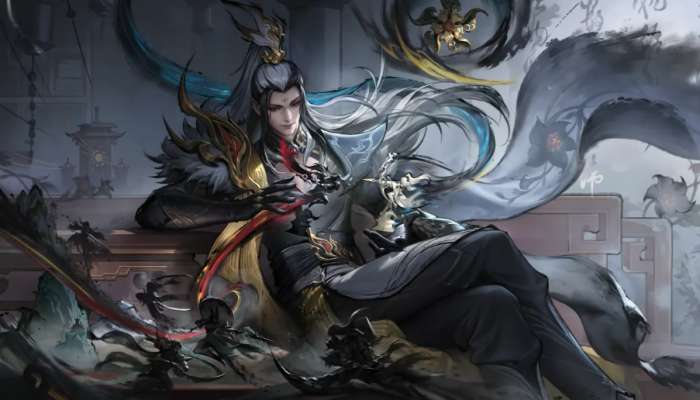 基于明世隐的形象特征和气质,我们以曼陀罗花为核心意象,塑造这位深藏不露的百晓楼主人。他银发高束,一丝不苟绾入曼陀罗花冠,冷寂中透出妖异。黑金华服间游走朱红丝线,似静似动,似雅似杀。宽袖垂云,金丝织就的披肩流光隐动,毛领外扩,气度卓然。