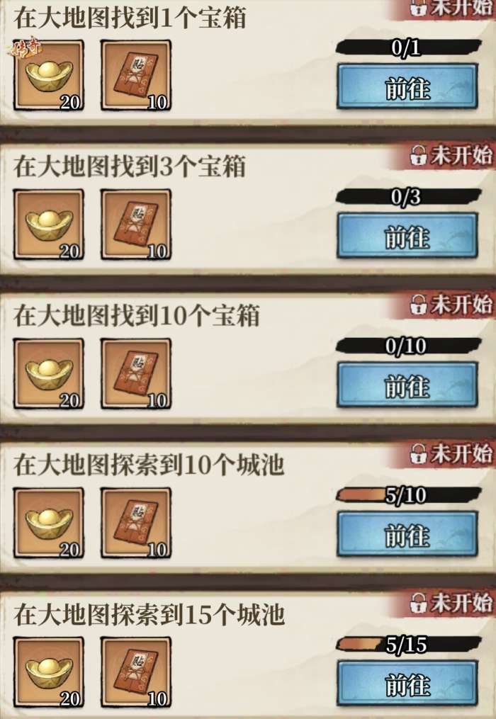 l 多进城池:随着剧情主线前往一个又一个城池,或者在大地图闲逛,看到城池就点进去,逛满10个、15个自动完成。