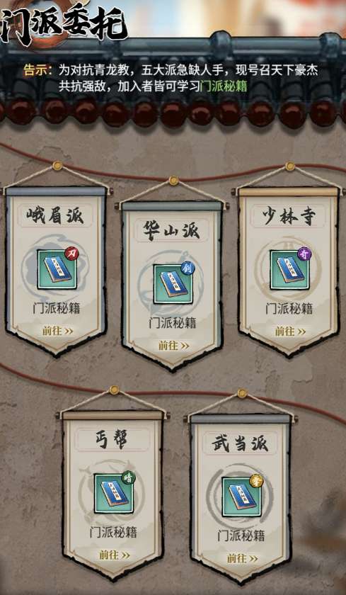 l 门派委托:还不够?【门派】系统中张榜的【委托任务】,每天帮各个门派做几件好事,掌门人自然愿意赠与你几本“密不外传”的秘籍。