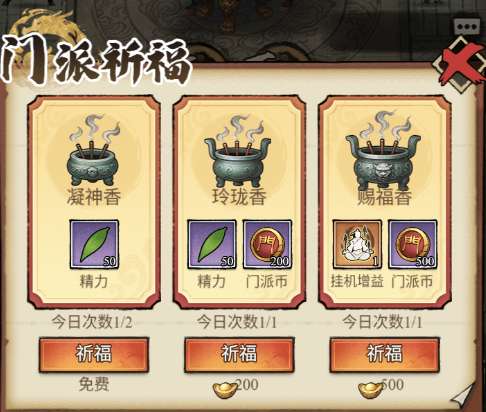 l 【门派祈福】用元宝:进入门派点击祈福,选择【玲珑香/赐福香】祈福,用元宝高性价比获取【门派币和挂机增益】资源。