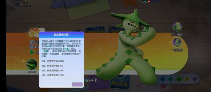 在完成一阶进化之后,就会变成梦歌仙人掌。作为风属性攻击型的宝可梦,核心的战术是围绕持续性伤害,还有中毒的效果。致命针刺技能实用性很出色,梦歌仙人掌在短暂蓄力之后,就会从体内射出无数道毒刺流,随即就会攻击面前的敌人,并且针对敌人造成590%的攻击力伤害。每道毒刺流针对敌方宝可梦都会有中毒的状态,中毒状态每秒就会造成50%的攻击力。