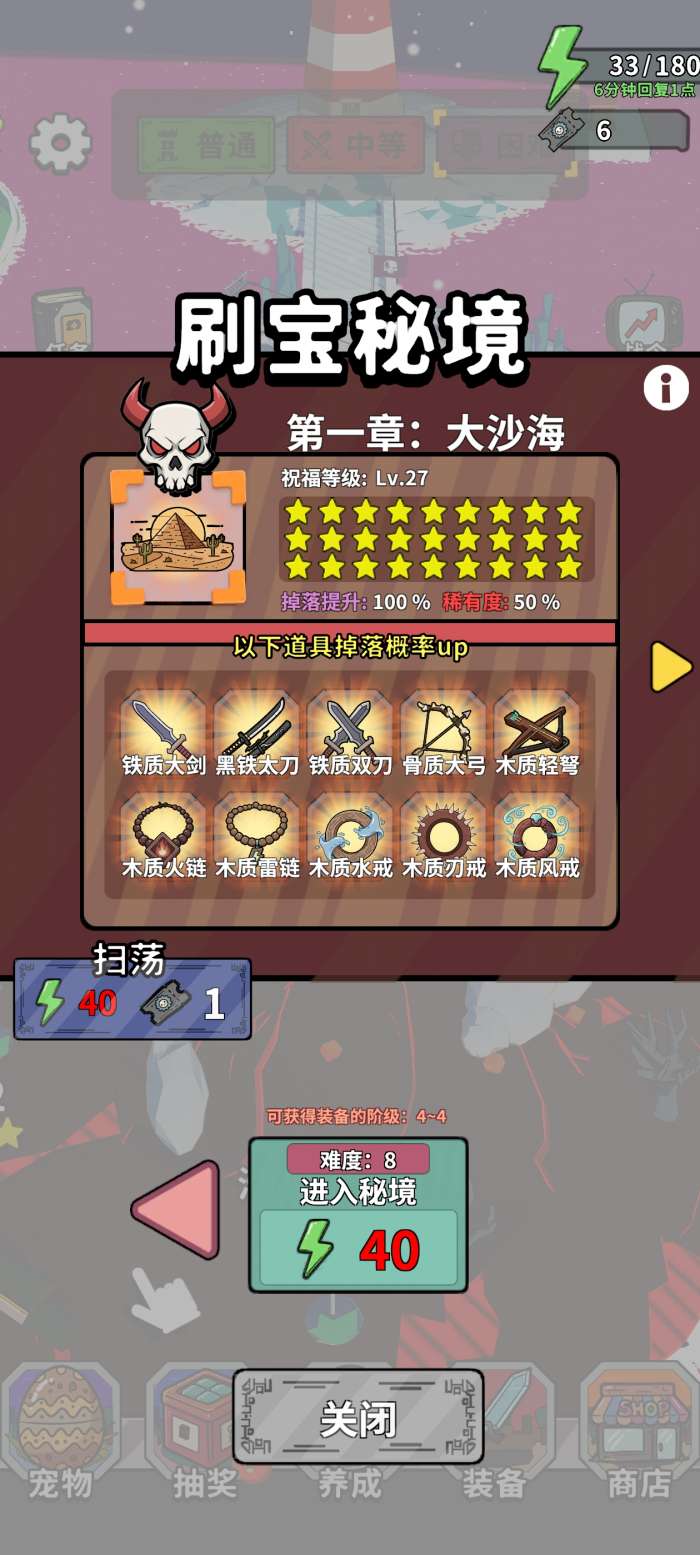 秘境是获取武器的重要途径,每一章结束后都会开启对应的秘境章节,玩家需要先进入打成功一关后方可利用扫荡券扫荡,机制并不是推图那种好几波,而是开始前给你很多金币,你需要自己升级基地选择对应的契约和塔的等级,撑过一波的猛烈攻势!全篇推图拿到的星星越多,也会影响秘境的掉落稀有度和数量!所以加油吧!