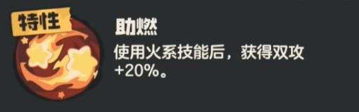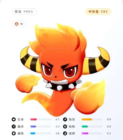 火花:开荒首选”火花”,前期弱火野怪居多,搭配“助燃”特性可以做到持续增伤的效果,从而在PVE中面对血量高的野怪时,可以打出可观的伤害快速解决战斗。而且在PVP方面,火神的速度属性值来到了130,导致其在公测PVP中也可以获得不错的表现。