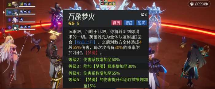 她的大招叫做万象梦火,这个技能使用的时候,她先会做出一个攻击上升的增益,并且是给全体的队友都带来两个回合提升的之后,还有一个增益是额外的触发效果,是给敌方的全体带来一个4段的连击伤害,这里4段造成的伤害是65%的数值,而且四段当中,每一次的攻击都会有30%的概率,可以附加给敌人一个梦魇的影响效果,后期她在潜能上面如果得到基础属性提升的话,还可以给自己的攻击、防御以及生命数值都提升5%的提升,所以有潜能效果的时候,她自身的能力会更好用。