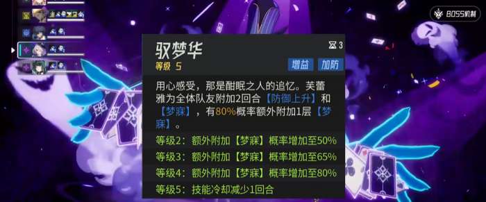 这个增益是给我方带来的效果,而减益给敌方带来的效果基本都是跟双方的行动进度有关的,而她的第二个技能叫做月梦华,月梦华这个技能是可以带来全体队友增加增益效果的,所以芙蕾雅是非常适合放在辅助增益位置上使用的一个角色,她使用玉梦华的时候可以给全体的队友来附加两个回合的增益效果,这里的增益效果体现在防御上升的数值以及梦寐的效果上面,且在同时还有80%的几率可以额外附加一层的梦寐,再给自己的队友增加增益。