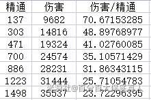 为了便宜观察,我给大家把不同精通对应的伤害,并且每一点精通对应的伤害做了一个表格。