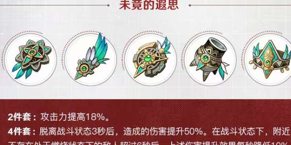 4件套:脱离战斗状态3秒后,造成的伤害提升50%。在战斗状态下,附近不存在处于燃烧状态下的敌人超过6秒后,上述伤害提升效果每秒降低10%,直到降低至0%;存在处于燃烧状态下的敌人时,每秒提升10%,直到达到50%。装备此圣遗物套装的角色处于队伍后台时,依然会触发该效果。