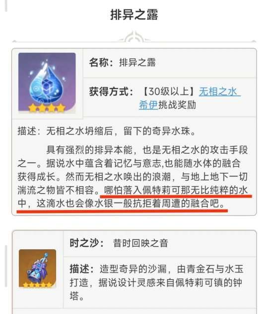 最后还有一些出现在无相之水掉落材料和圣遗物昔时之歌的时之沙部分,那问题来了,这个普普通通的小镇却有无比纯粹的水,其中有着怎样的秘密还要等更新后慢慢探索了
