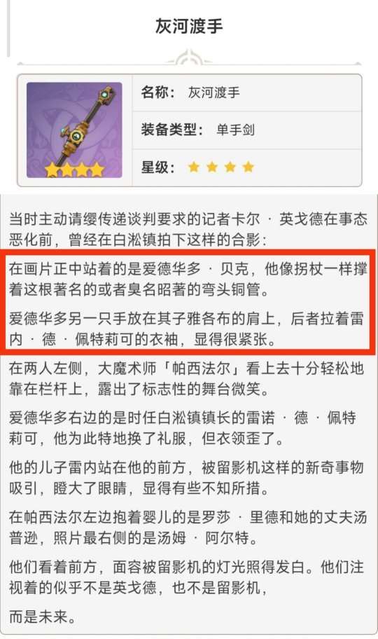 而「佩特莉可镇」出现的另一个地方则出现在枫丹钓鱼兑换的武器中。这一根小小的钢管中出现了一个名字,雷诺·德·佩特莉可,时任白淞镇镇长,而他的儿子就是雷内,雷内·德·佩特莉可。所以雷内的老家也是佩特莉可镇的,没想到吧。(雷内·德·佩特莉可 可以参考芙芙PV中出现过的芙宁娜·德·枫丹,“德”理解为“的”的意思,所以是佩特莉可的雷内。)