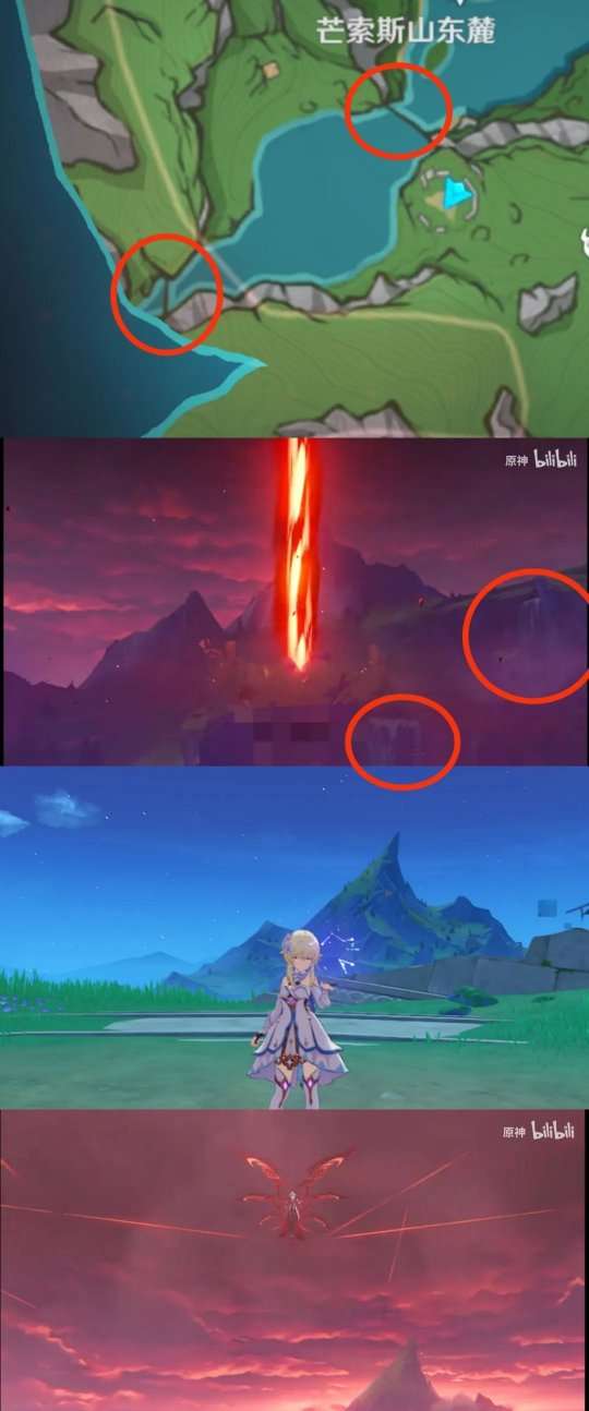 至于「仆人」周本的位置应该在这里,可以看到图二中有两处瀑布,在图一也可以找到,同时图三四背景的山也是一模一样的,不过现在周围建筑差距还是比较大的,等版本更新应该会有变化