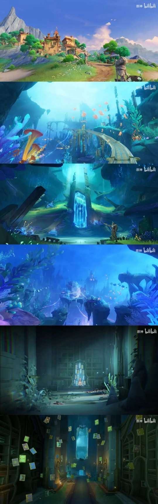 同时画面闪过了三张新地图里的景象,新地图「佩特莉可镇」是位于枫丹大湖南部的一个小岛,而古国「雷穆利亚」的遗址就在其水下