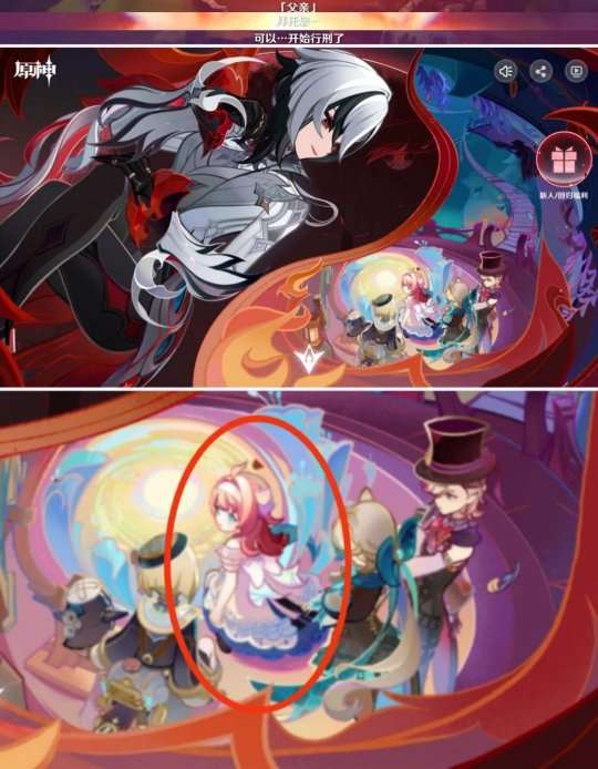 在4.6版本的先行展示页中就出现了这样一个符合条件的人,和林尼三兄妹站在一起的粉红发色的可爱少女,在「仆人」的注视之下,同时画面还构成了一种微妙的阴阳鱼形状,很有意思